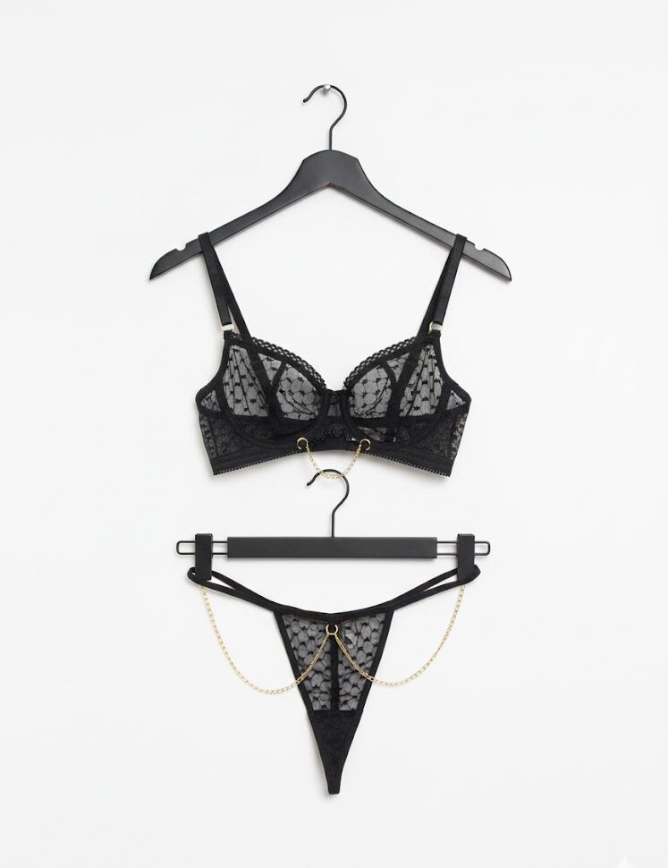 El Conjunto Eclipse combina sensualidad y elegancia con su diseño en encaje negro y detalles dorados. Su brassier con varilla realza el busto mientras la panty tipo tanga con cadenas doradas añade un toque sofisticado y atrevido. Ideal para mujeres que aman destacar y sentirse poderosas.